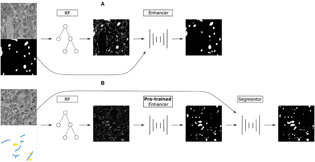 The remarkable performance of Convolutional Neural Networks on image segmentation tasks comes at the cost of a large amount of pixelwise annotated images that have to be segmented for training. In contrast, feature-based learning methods, such as the Random Forest, require little training data, but rarely reach the segmentation accuracy of CNNs. This work bridges the two approaches in a transfer learning setting. We show that a CNN can be trained to correct the errors of the Random Forest in the source domain and then be applied to correct such errors in the target domain without retraining, as the domain shift between the Random Forest predictions is much smaller than between the raw data. By leveraging a few brushstrokes as annotations in the target domain, the method can deliver segmentations that are sufficiently accurate to act as pseudo-labels for target-domain CNN training. We demonstrate the performance of the method on several datasets with the challenging tasks of mitochondria, membrane and nuclear segmentation. It yields excellent performance compared to microscopy domain adaptation baselines, especially when a significant domain shift is involved.